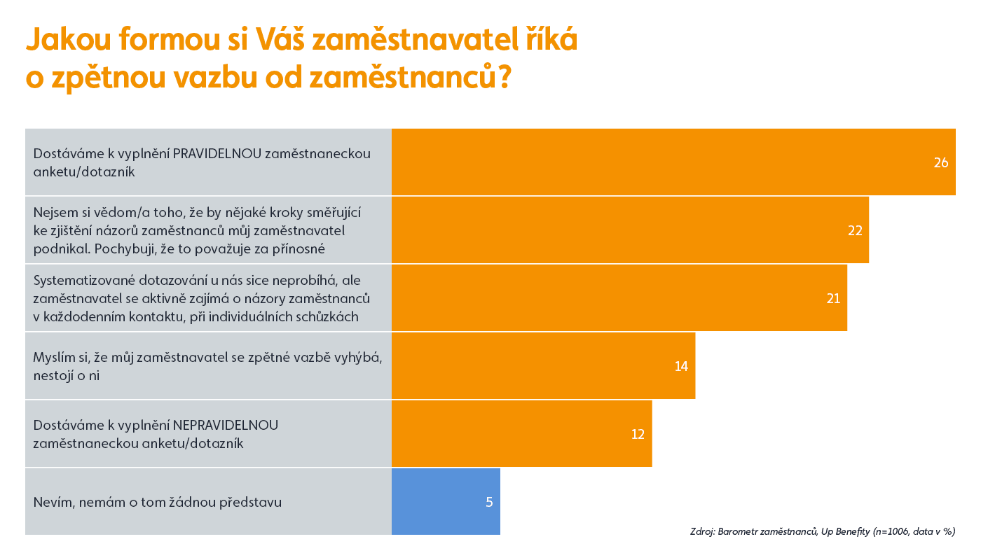 36 % zaměstnanců českých firem a institucí si myslí, že zaměstnavatelé nestojí o jejich názory nebo se jim dokonce záměrně vyhýbají. Ostatní sice zpětnou vazbu od zaměstnanců nějakou formou sbírají, ale často s ní nijak nepracují. Komunikace je přitom pro 87 % zaměstnanců důležitým měřítkem, zda jsou v práci celkově spokojeni. Vyplývá to z Barometru zaměstnanců od Up Benefity mezi více než 1 000 respondenty.